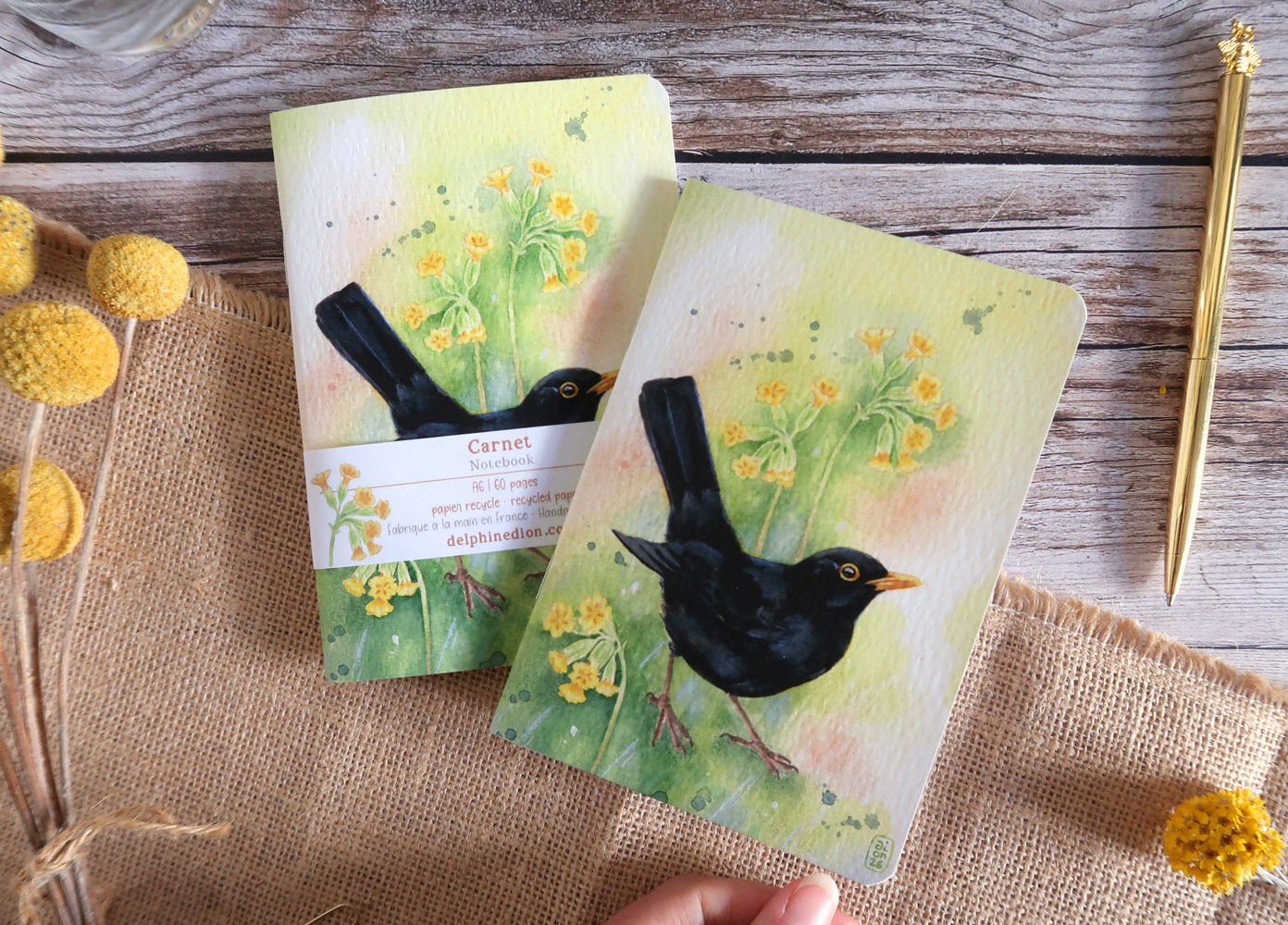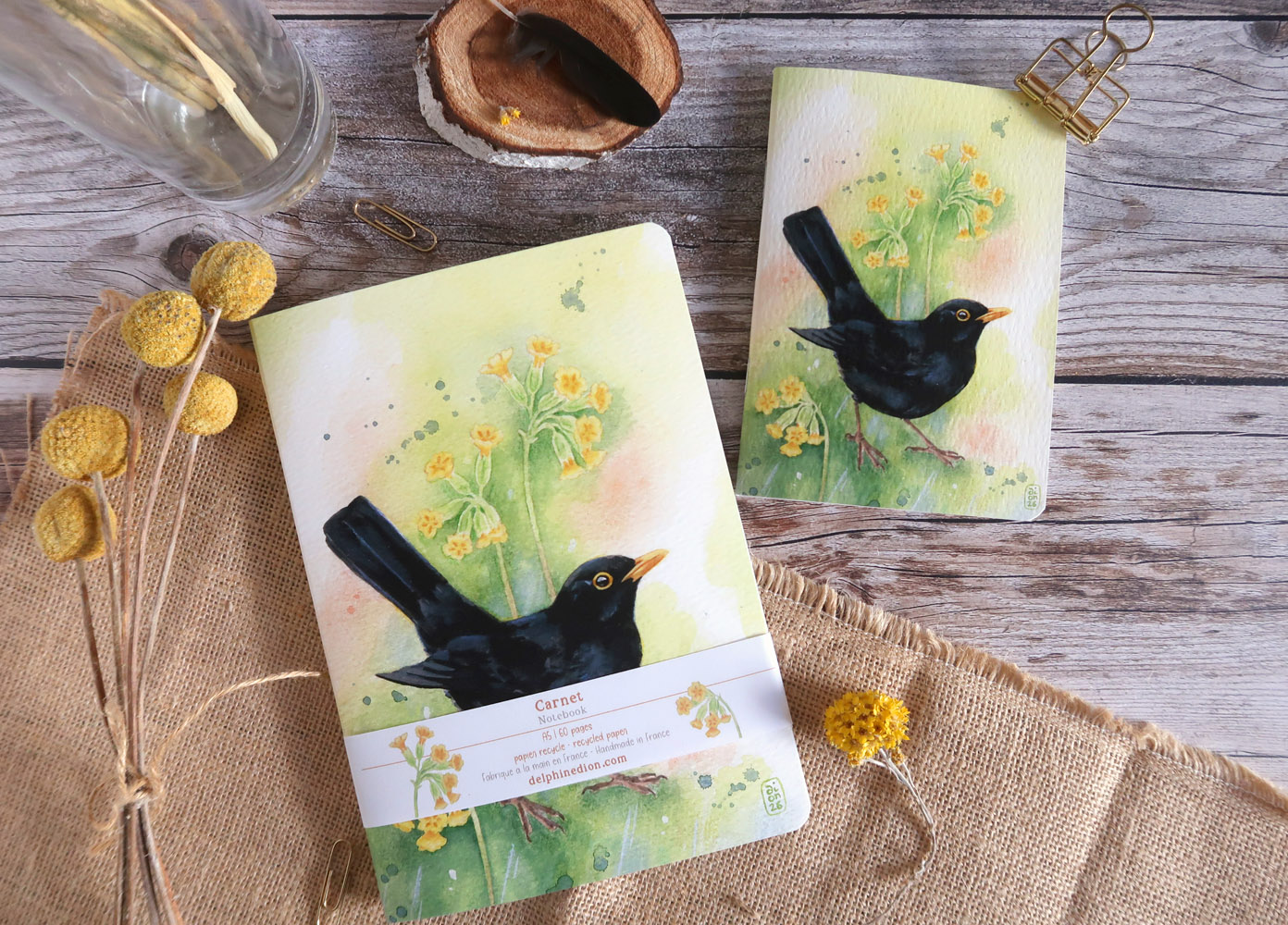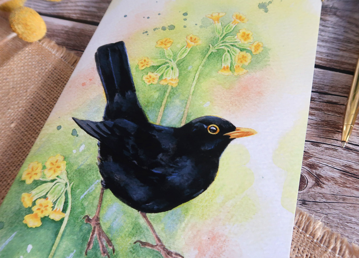 Adoptez ce carnet illustré de l’une de mes aquarelles, représentant un Merle noir accompagné de Primevères officinales.