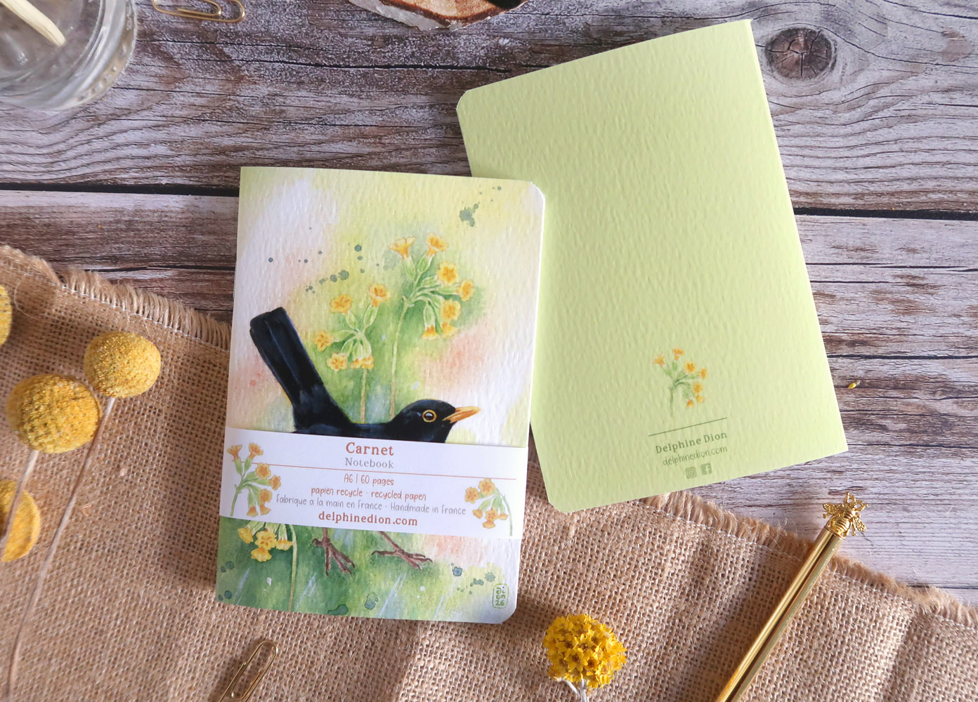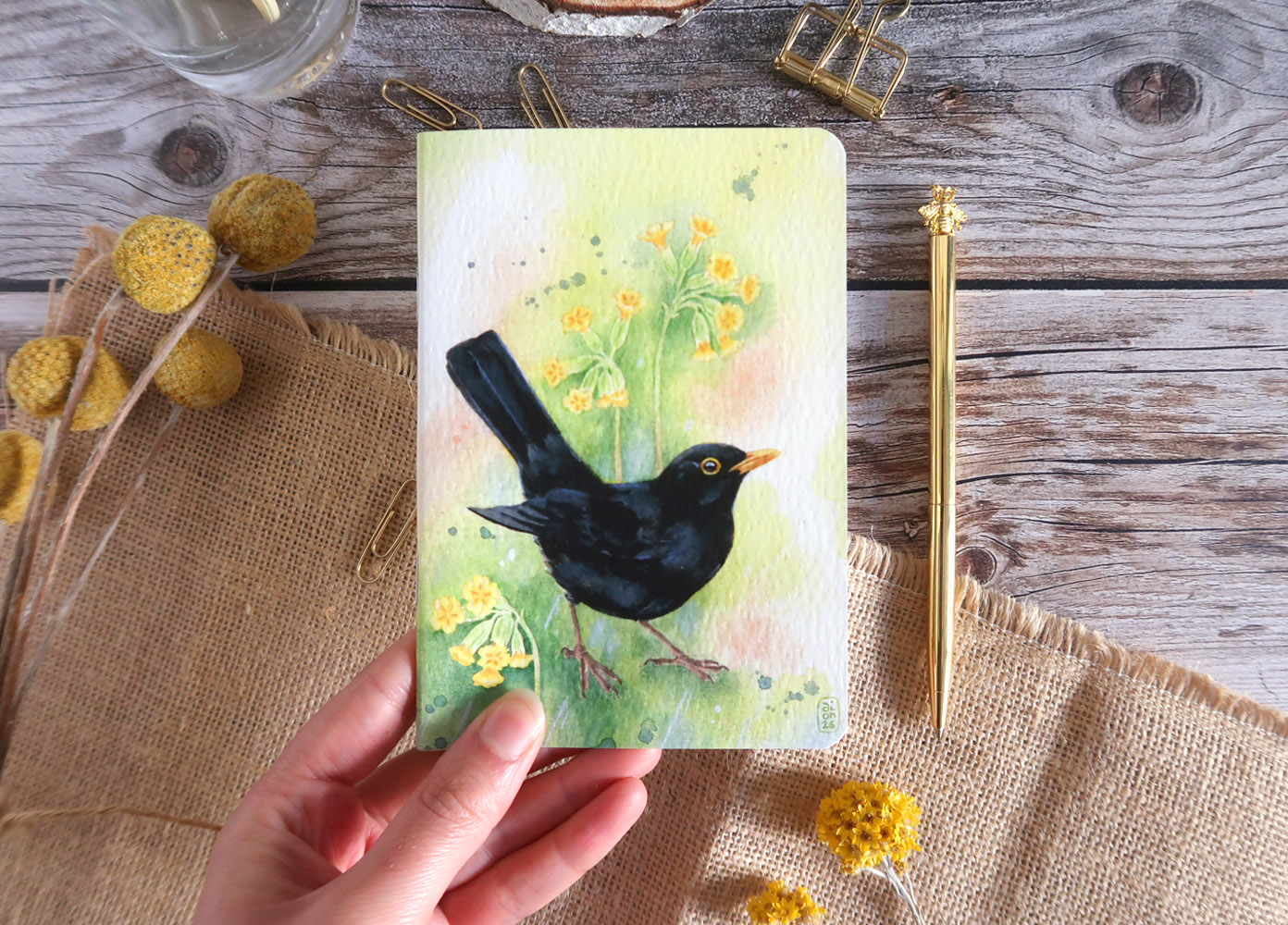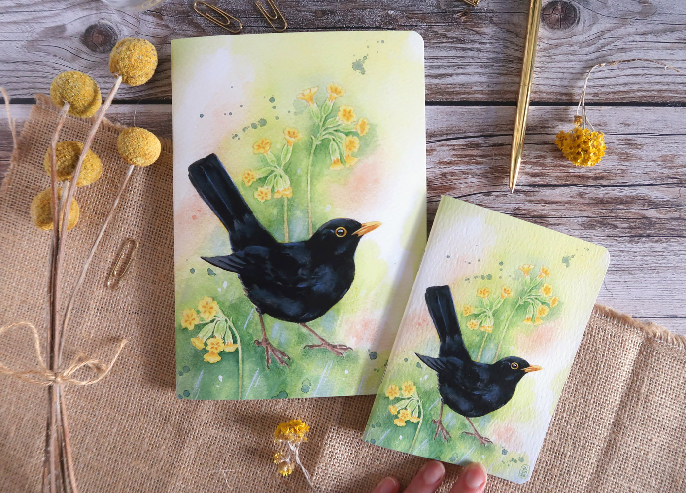 Adoptez ce carnet illustré de l’une de mes aquarelles, représentant un Merle noir accompagné de Primevères officinales.