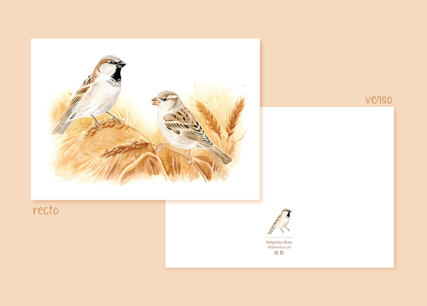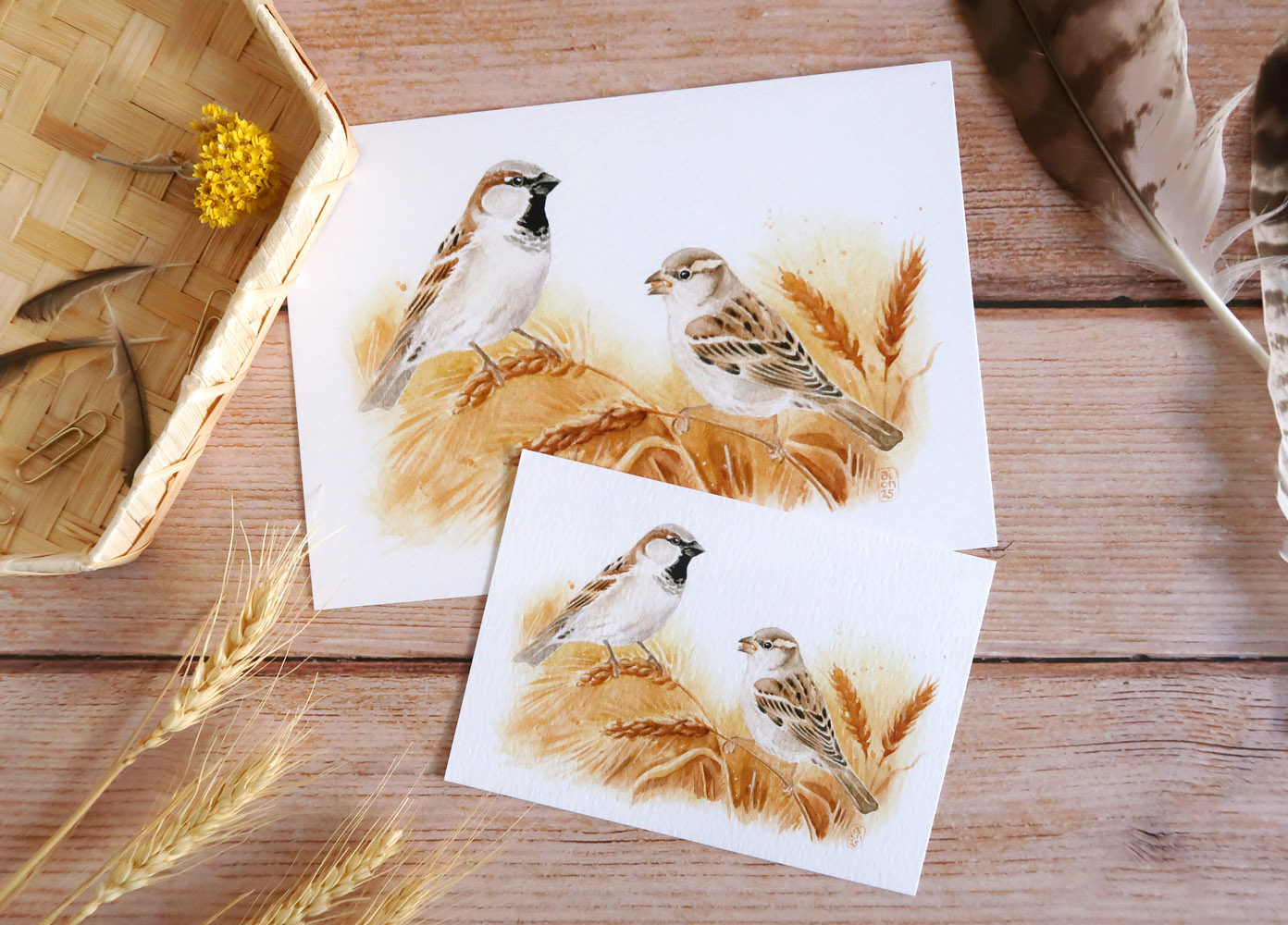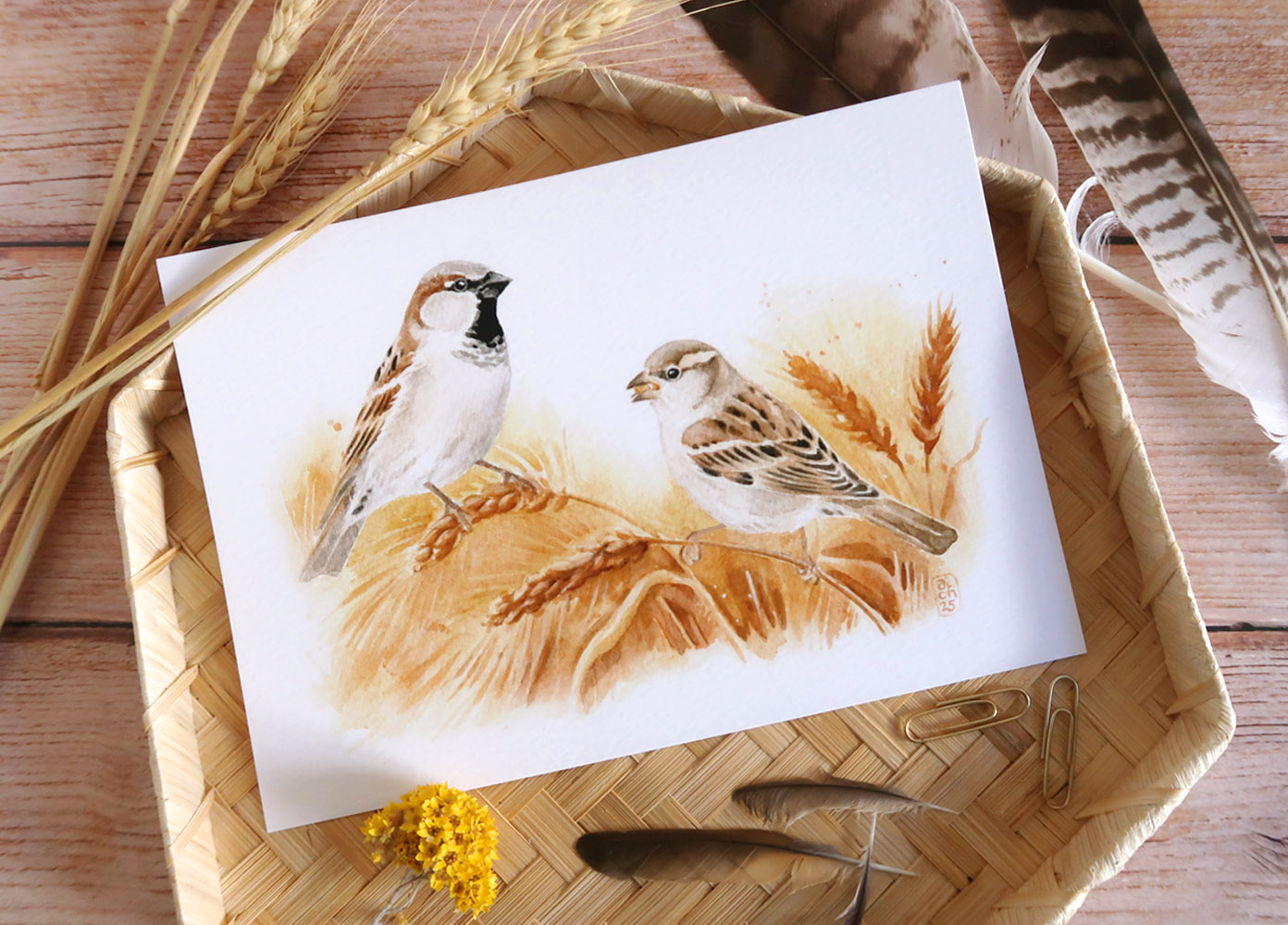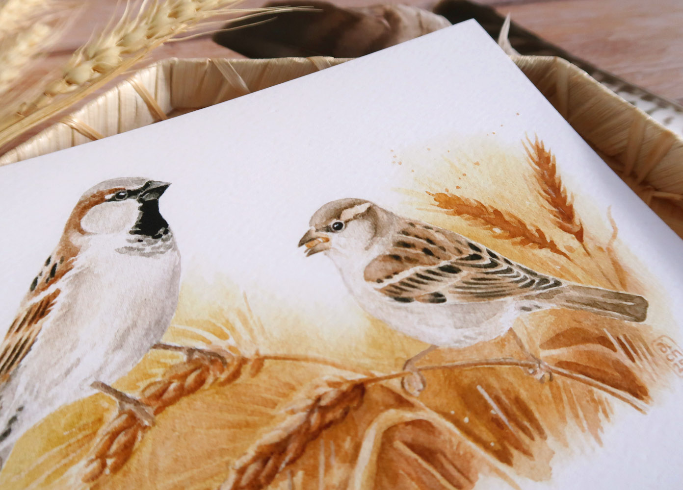 Reproduction d’aquarelle d’un petit couple de moineaux domestiques dans les blés murs.
