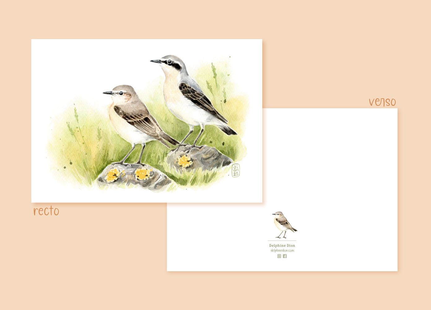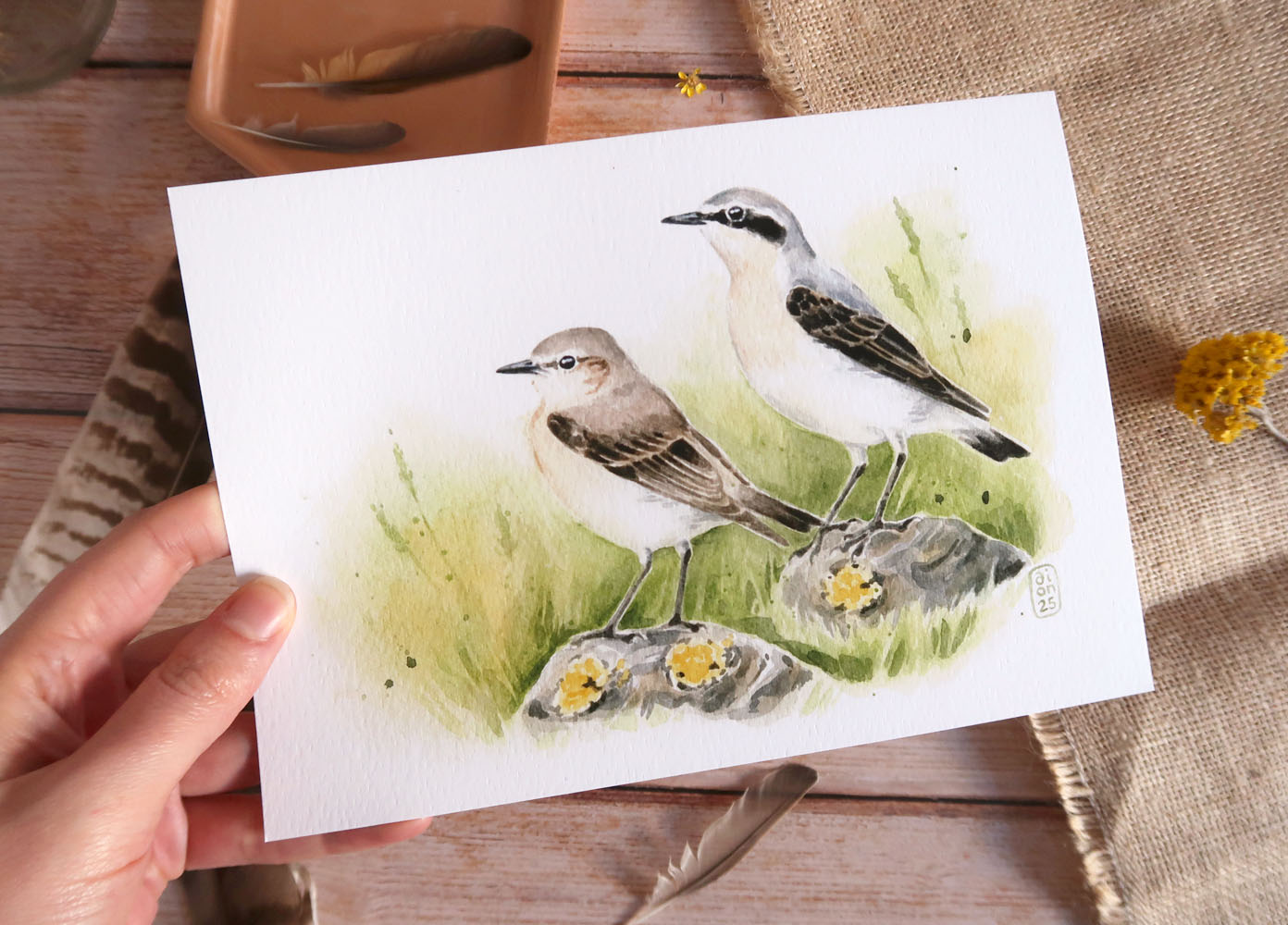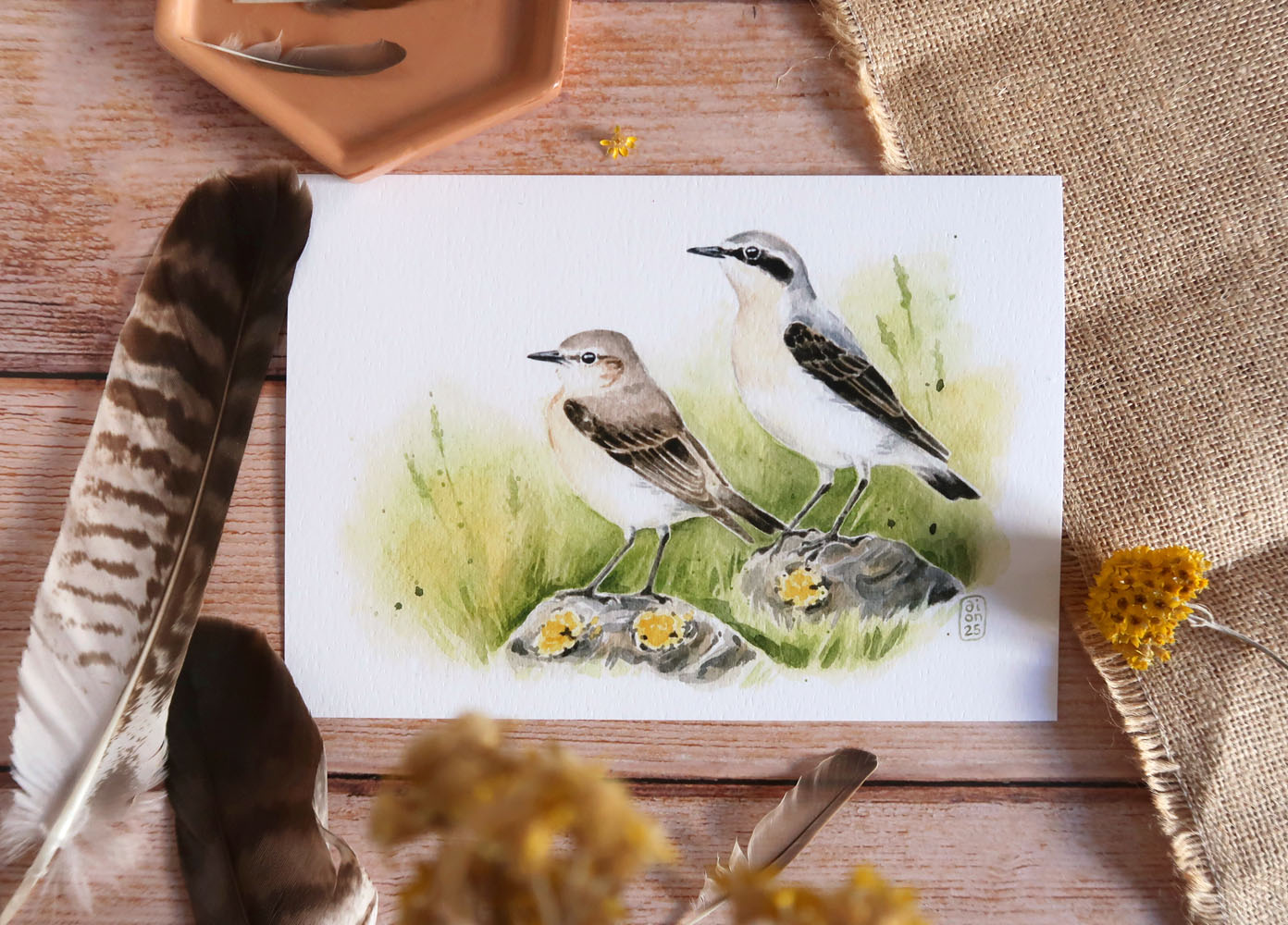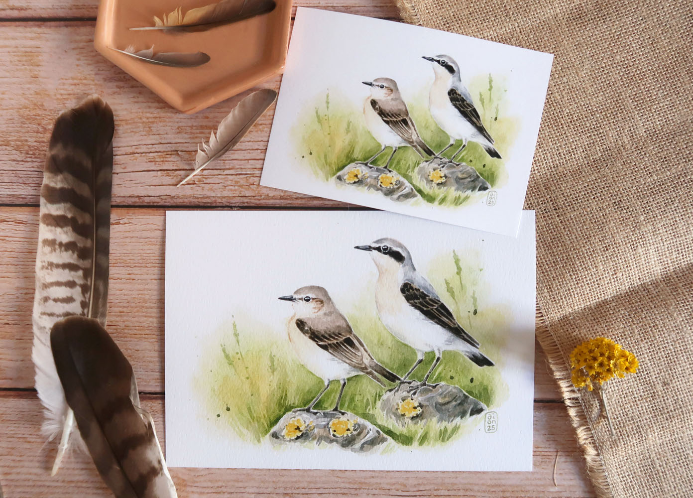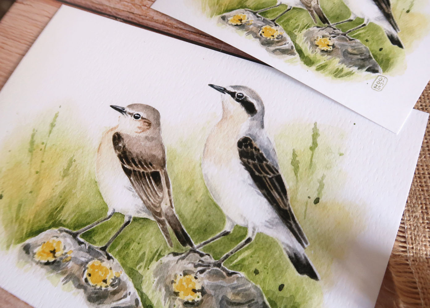 Reproduction d’aquarelle d’un petit couple de traquets motteux.